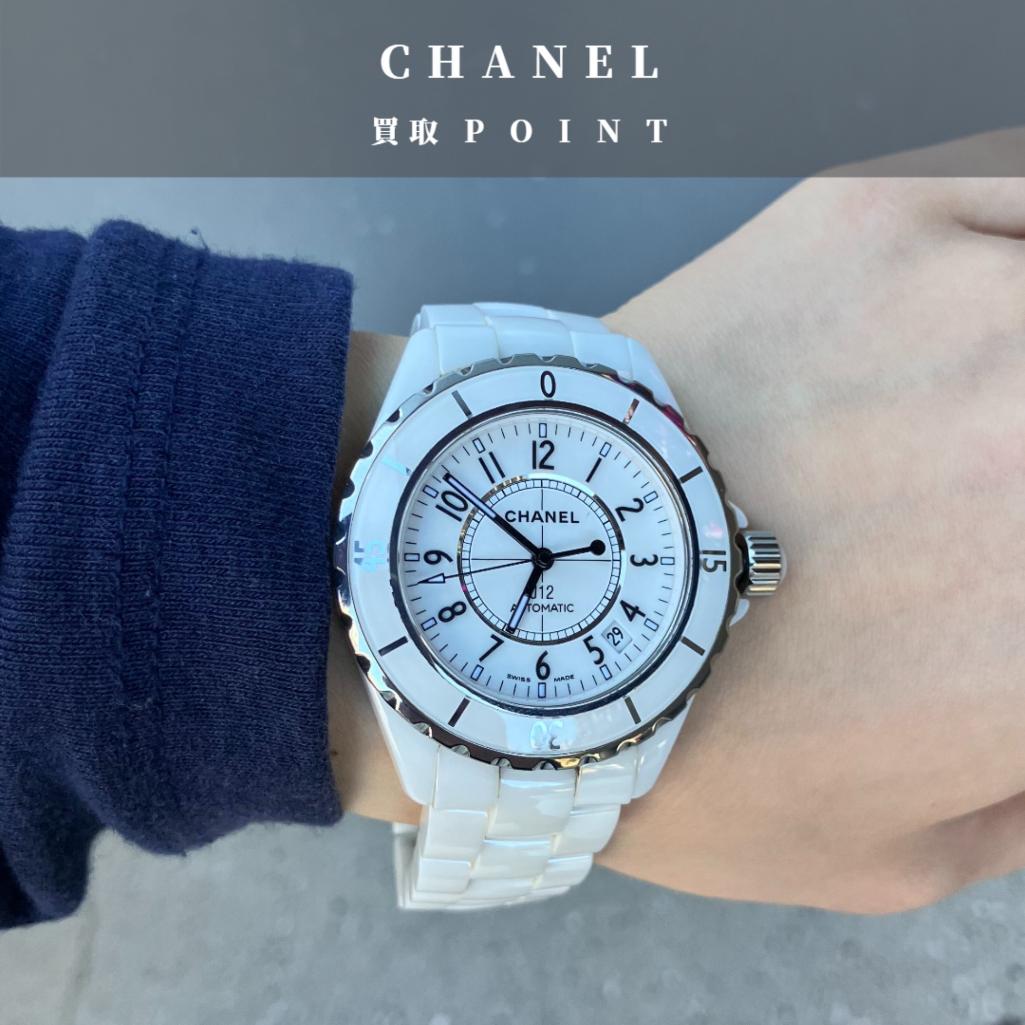 CHANELのアイコンウォッチ、「J12」でございます。セラミックに包まれたケースと