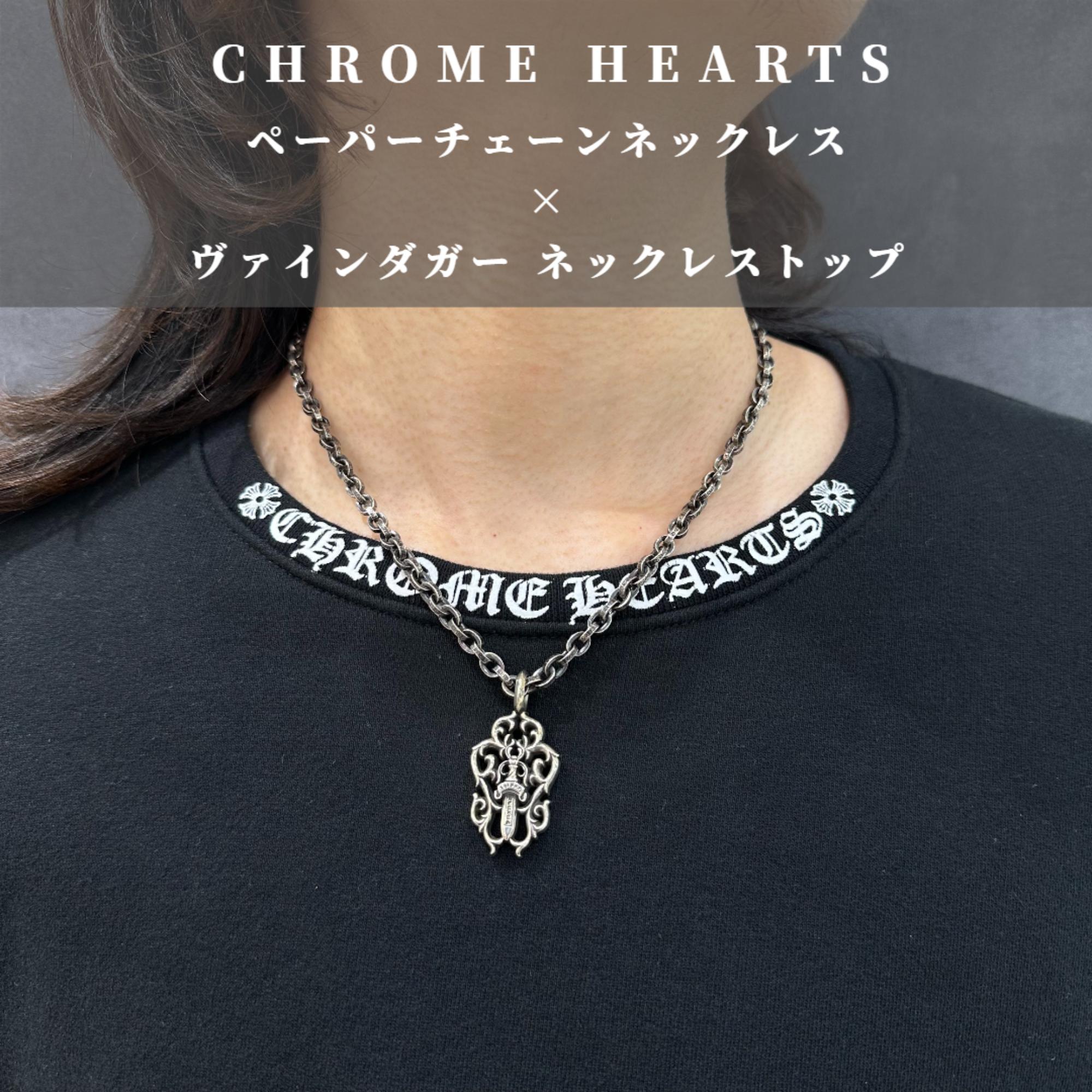 ① 人気モチーフと定番チェーンの組み合わせ クロムハーツの定番チェーンであるペーパーチェーンと、人気モチーフのヴァインダガーを組み合わせたネックレスは需要が高く、中古市場でも安定した人気があります。セットが探されているお客様も多いので、是非まとめてお持ち込みくださいませ。
