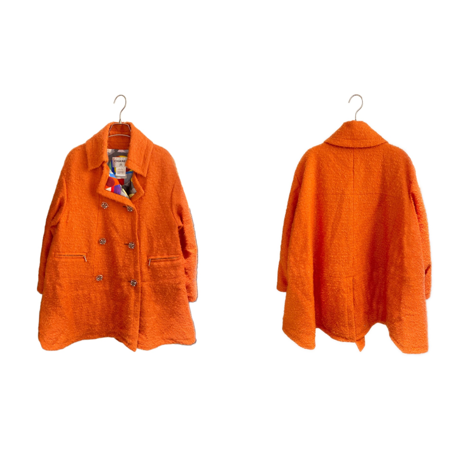 CHANELを象徴するツイード素材を使用したダブルコートでございます。重厚感のある上質なツイードが、クラシカルでエレガントな雰囲気を演出します。フロントのダブルボタン仕様により、構築的で洗練されたシルエットを実現。ボタンや美しいカッティングなど、細部にまでブランドのこだわりが感じられる一着です。
