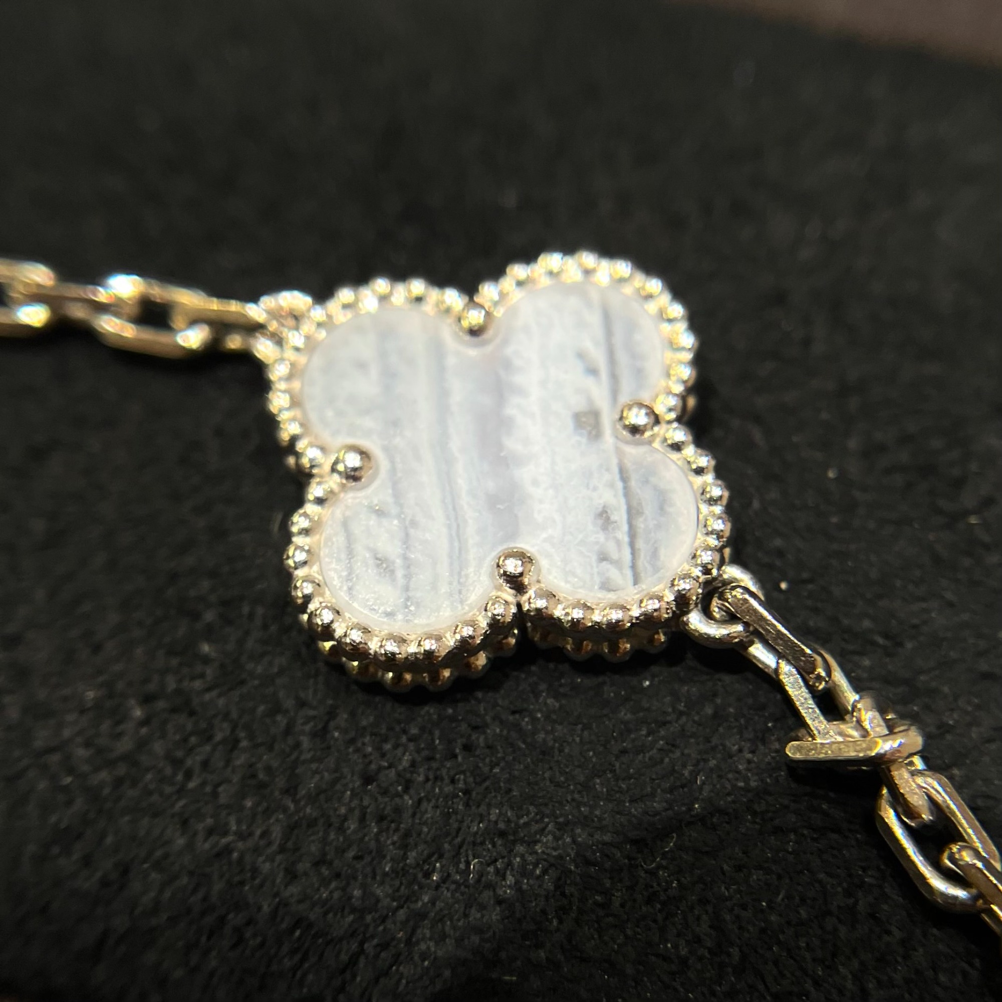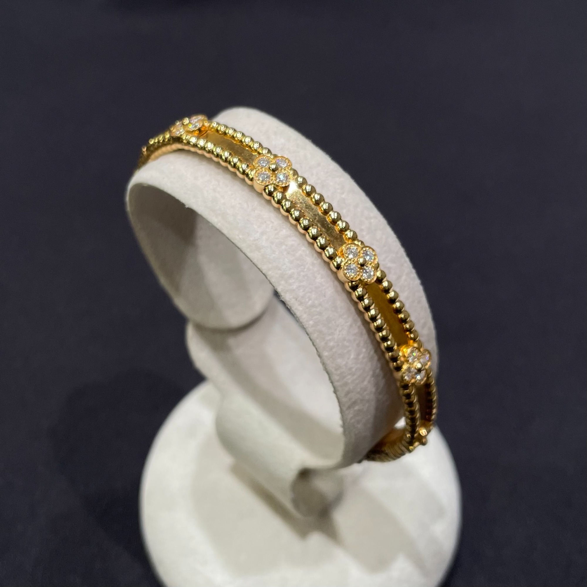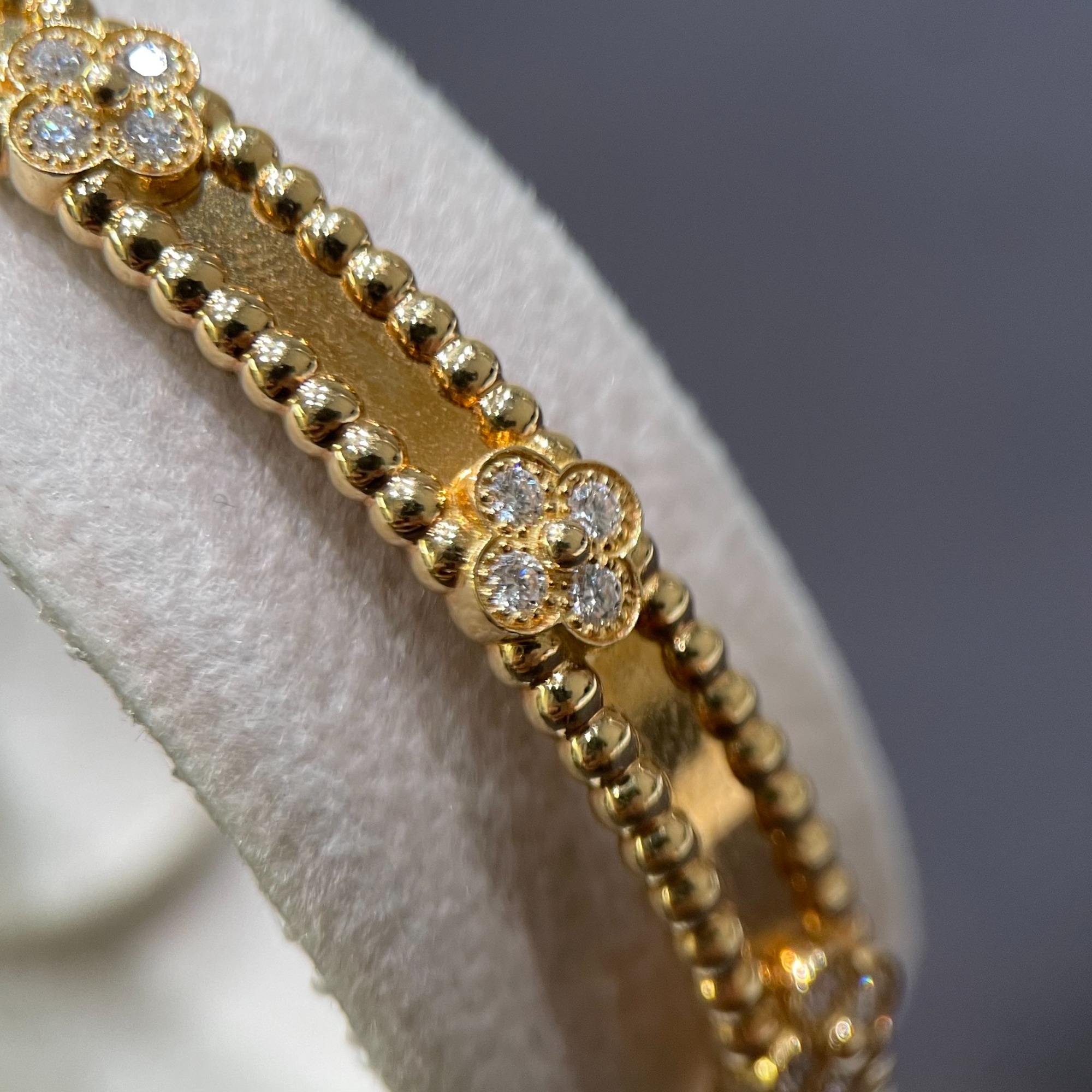 クローバーの一つひとつは中央に繊細なゴールドビーズを配し、その