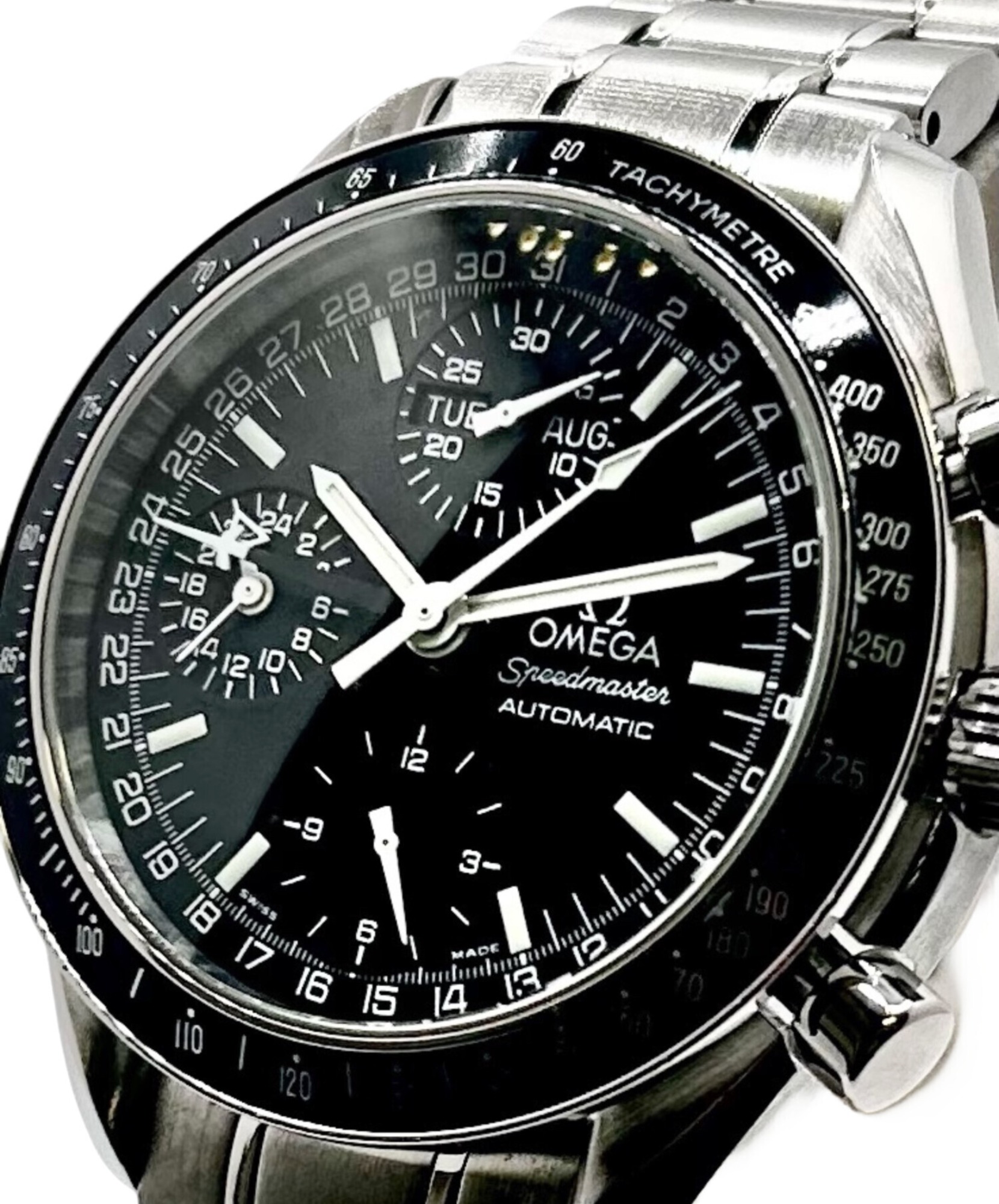 オメガを代表とするモデル「スピードマスターデイデイト」でございます。
