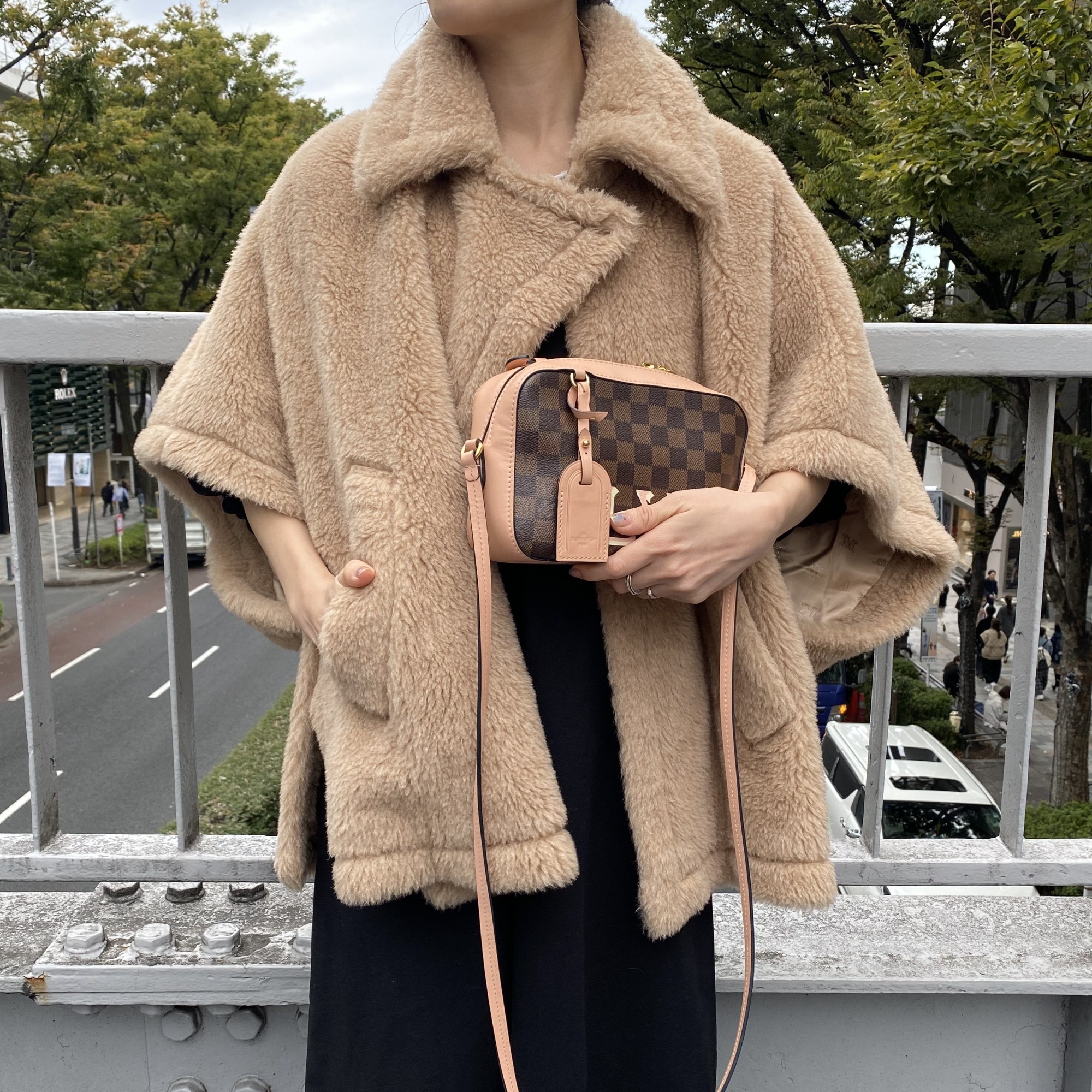 左肩付近に配したボタンを留めれば、冷たい風をしっかりと防ぎつつ、美しいシルエットをキープする、デザイン性と機能性を兼ね備えたアイテムです。